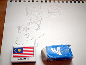 今度は消しゴム。近くにあった日本製消しゴムと勝負!!マレーシアの消しゴムは国旗がデザインされている。