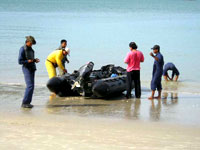 「↓ダタイベイの手前の地元の海水浴場・・・Pasir Tengkorak Beach にて。珍しい人々・・・軍人さんかなぁ・・・ がいましたのでこっそり撮影。何をしていたかは不明ですが。。。(Mieさん)」 うーむ。たしかに怪しい。