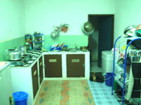 ●キッチン L型のシンク。やはり奥様がいるので綺麗に片付いています。 左に見える奥の部屋はトイレと浴室(水浴び部屋)があります。 |