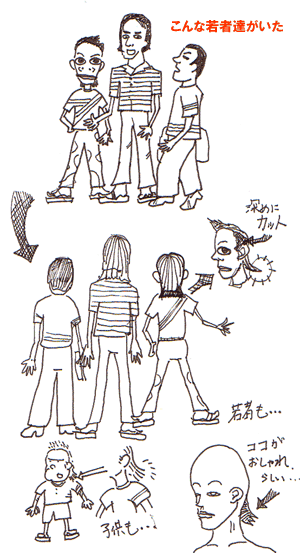 特に注意していたわけではないですが、こんなカットの人々が時々いたと思う.