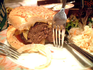 <ポイント> マレーシア到着当日って、航空便の関係で夜中が多いですよね。 そこでよくルームサービスを使うと思いますが、私達の場合、頼んだもの以外に豪華なフルーツがてんこもりでした。 適当にイエスなんていっちゃだめですな。 ちなみに下の写真は「アンダマンホテル」ルームサービスのハンバーガー。 でかいです。