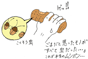 <ポイント> あれは思い出すだけでも寒気がします・・・。 2年前、クアラトレンガヌへ旅行した時の事。ストラビーチリゾートの朝食でおいしそうなパンをコーヒーといっしょに食べていました。 「ああ、ゴマ入りパンだ」と思いきや、なんとゴマだと思っていたつぶつぶすべてが小さなムシでした。 マレーシアへ行ってゴマ入りパンらしきものを食べるときには要注意です。