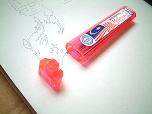 今度は消しゴム。近くにあった日本製消しゴムと勝負!!マレーシアの消しゴムは国旗がデザインされている。