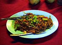 久々の現地の料理店。この蛍光灯の暗さ加減と少々?の不衛生さ、熱帯のねっとりした空気が最高です。 そしてチャーキォティアオを食べようと思ったけども、久しぶりのマレーシアって事もあって本場のゴレン系を食べたい! と思い、定番ミーゴレンとミースープを注文。 めちゃウマというほどでもないんですが、ほっとする味。調味料のサンバルが食欲をそそる。 いっしょに冷たいビールでも飲みたいのですが、マレーはイスラムの国のであまりお酒は置いていません。 そこでフレッシュジュースを注文。健康的であります。 いつも思うのですが、どこの店でも一皿の分量が少ない気がする。腹八分目って事だろうか。 それともマレーの人ってみんな小食?なんだろうか。。けっこうスリムな人多いし…。