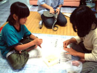 ●折り紙講習 ナナチャン家にあった折り紙で鶴を折る。子供達は飲みこみが速くてすぐ覚えてしまった。 |