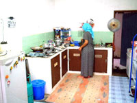 ●キッチン L型のシンク。やはり奥様がいるので綺麗に片付いています。 左に見える奥の部屋はトイレと浴室(水浴び部屋)があります。 |
